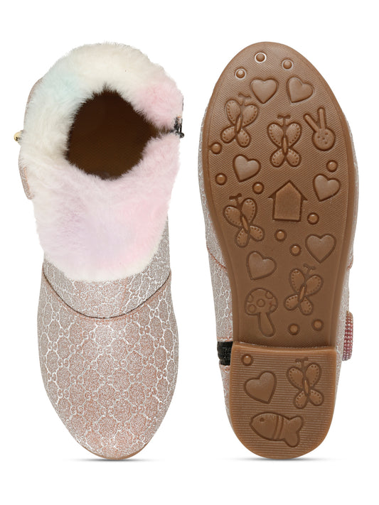 Tiny Bugs Girls Party Wear Embellished Fur Boots - Beige